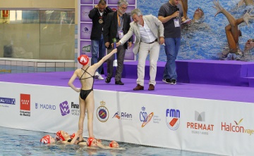 28/05/2018 - El público en las gradas se preguntaba qué era lo que el equipo de Natación Artística del Centro de Tecnificación de la Federación Madrileña —al que damos las GRACIAS desde estas líneas por su colaboración— había bajado a buscar en el fondo de la piscina del M—86 en el descanso previo a la competición, pero con las gradas repletas de público. Y era un cheque, un cheque valorado en los 8.472 euros recaudados para la Asociación Española Contra el Cáncer por parte de la NATACION española.